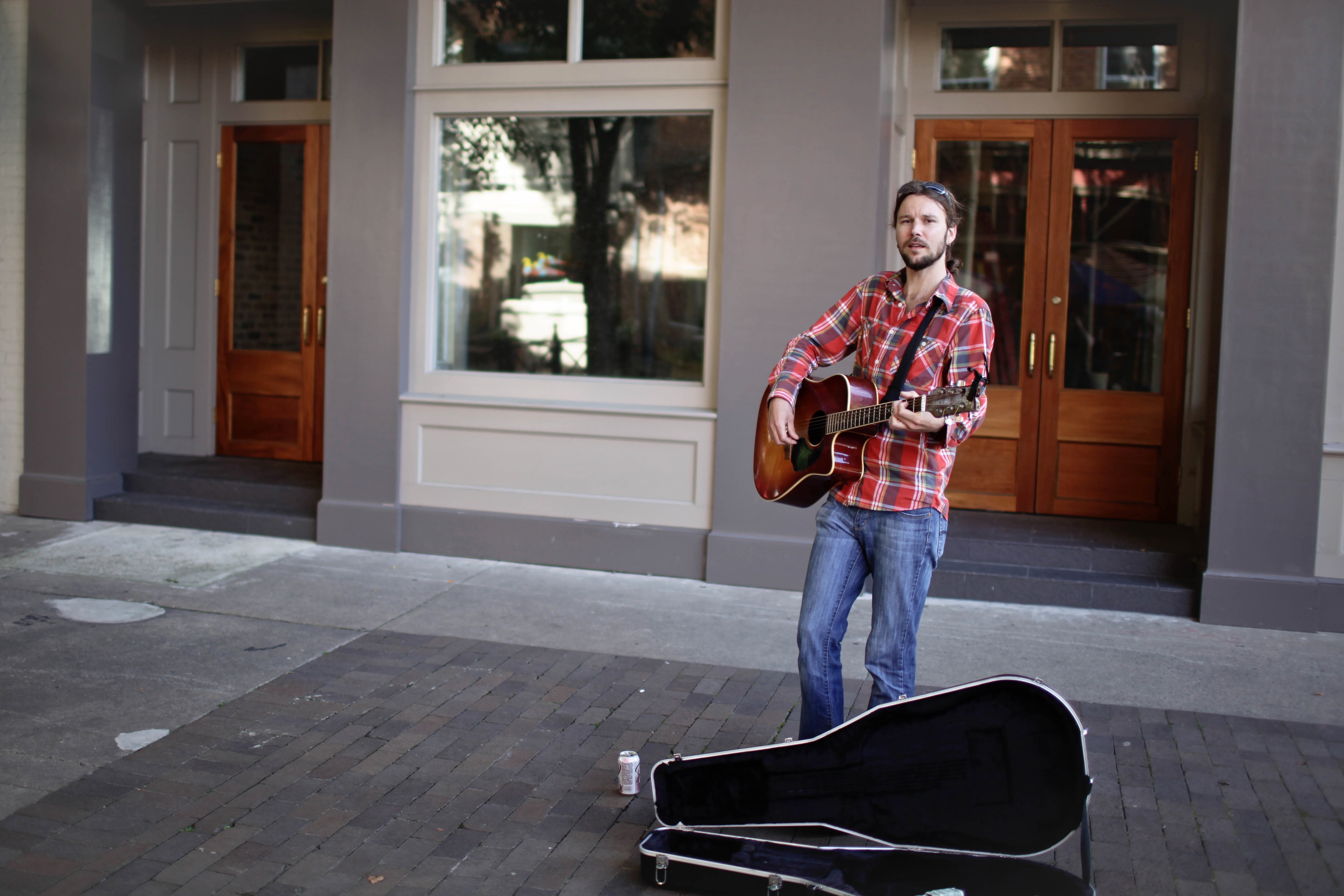 The photograph captures a solo musician performing on a quiet street, exuding a sense of passion and intimacy. Dressed in a casual plaid shirt, he holds his guitar confidently while a guitar case lies open at his feet, hinting at the spontaneity of street performances. Soft natural light floods the scene, creating a warm, inviting atmosphere that draws the viewer in.