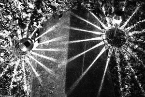 In this striking black-and-white photograph, a concrete path is bathed in the geometric shadows of metal lanterns, creating an intricate display of lines and angles. The ambient lighting casts a moody, atmospheric feel, contrasting sharply with the surrounding autumn leaves, which blanket the ground. The composition draws the eye inward, inviting contemplation of the interplay between light and shadow in a tranquil outdoor space.