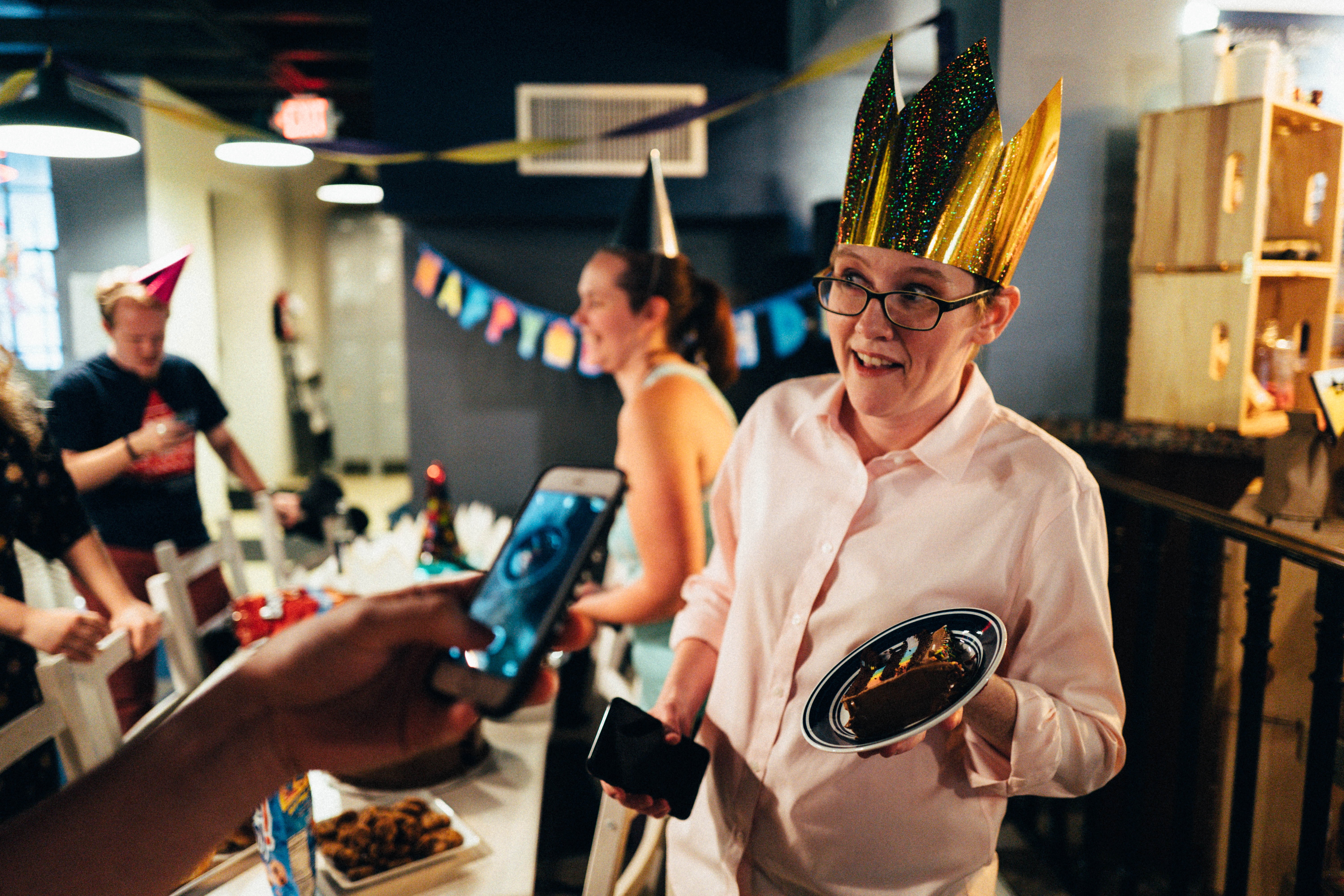 A lively birthday scene captures the essence of joy and camaraderie. The subject, wearing a striking golden crown and holding a plate of cake, smiles brightly amidst a backdrop of colorful decorations and cheerful party hats. The warm, inviting lighting enhances the festive atmosphere, while guests interact energetically, creating a sense of shared happiness.
