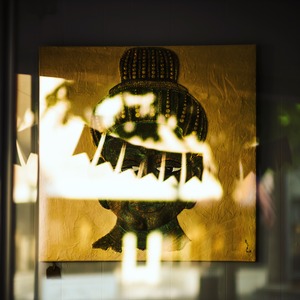 The photograph captures a serene visage of a Buddha painting, subtly illuminated by soft, golden light. The composition features reflections and shadows that create a layered effect, enhancing the mood of tranquility and introspection. Leaves and light interplay around the artwork, adding a sense of nature and calm to the scene.