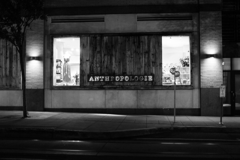 The photograph captures a moody tableau of a storefront, defined by the striking black-and-white contrast. The warm glow from the window invites curiosity, framing a dress against the backdrop of rustic wooden panels, while nearby street lighting enhances the urban atmosphere. A solitary tree stands guard in the foreground, adding a touch of nature to the bustling city scene.