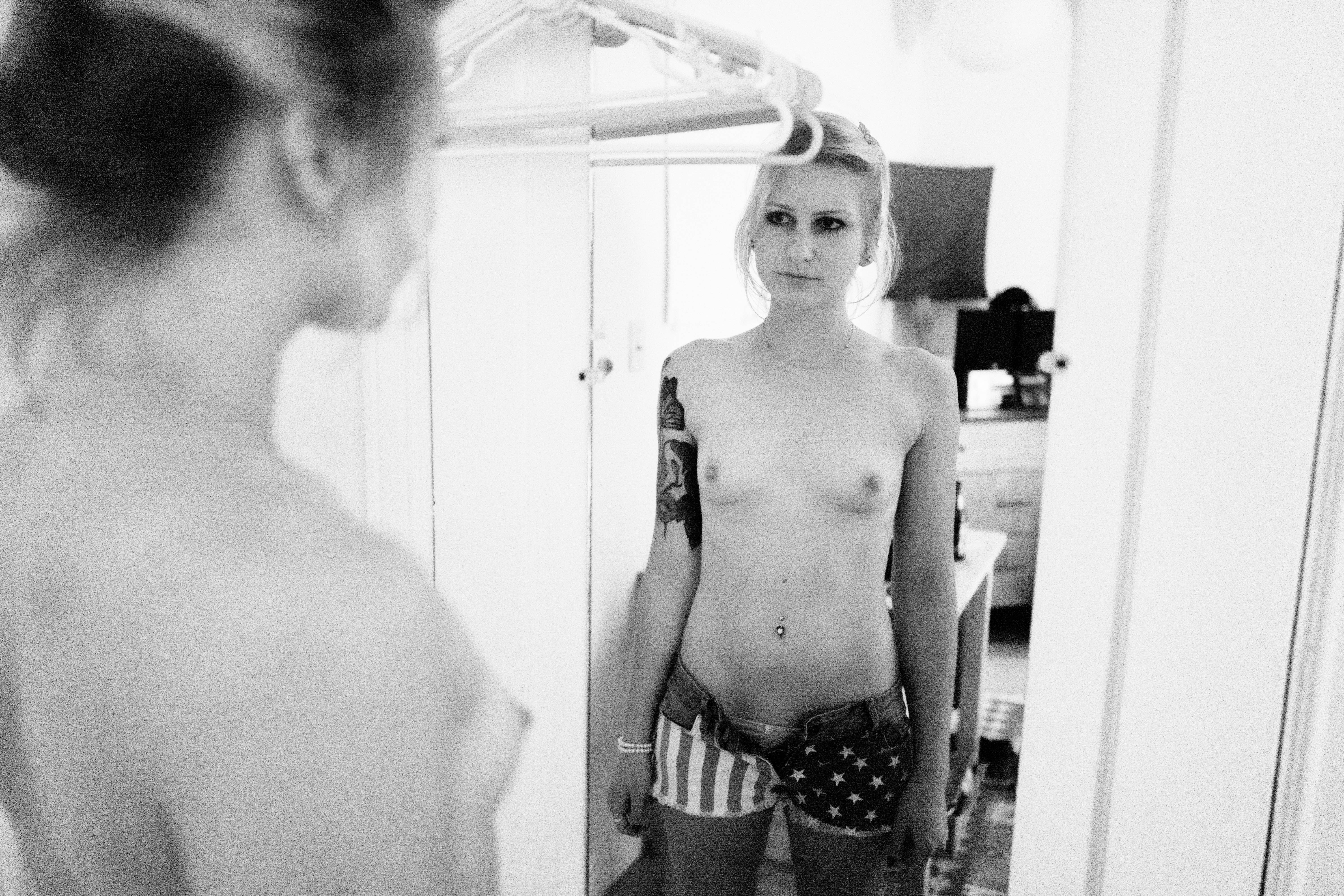 In a softly lit room, a young woman stands in front of a mirror, gazing at her reflection with a contemplative expression. The black-and-white composition enhances the introspective mood, while the contrasting elements of her casual outfit and body art hint at individuality and self-exploration. The choice of lighting casts gentle shadows, adding depth to the scene and emphasizing her thoughtful demeanor.