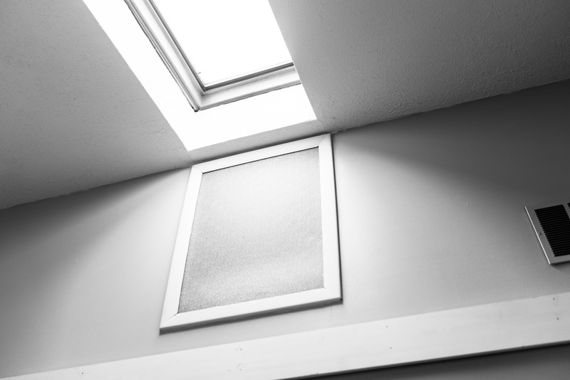 This photograph captures a minimalist view of a ceiling and wall, highlighting a skylight above and a frosted glass panel adjacent to it. The stark black and white contrast emphasizes the interplay of light and shadow, creating an atmosphere of tranquility and introspection. The composition draws the viewer's eye upward, invoking a sense of space and openness within a confined setting.