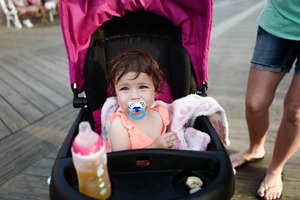 The photograph captures a delightful moment of a young child sitting in a bright pink stroller, exuding innocence and curiosity as she smiles at the camera. The warm natural light enhances the cheerful ambiance, with the soft textures of her blanket contrasting against the sleek stroller and wooden background. The playful colors of her outfit and the gentle expressions create a heartwarming scene indicative of carefree childhood moments.
