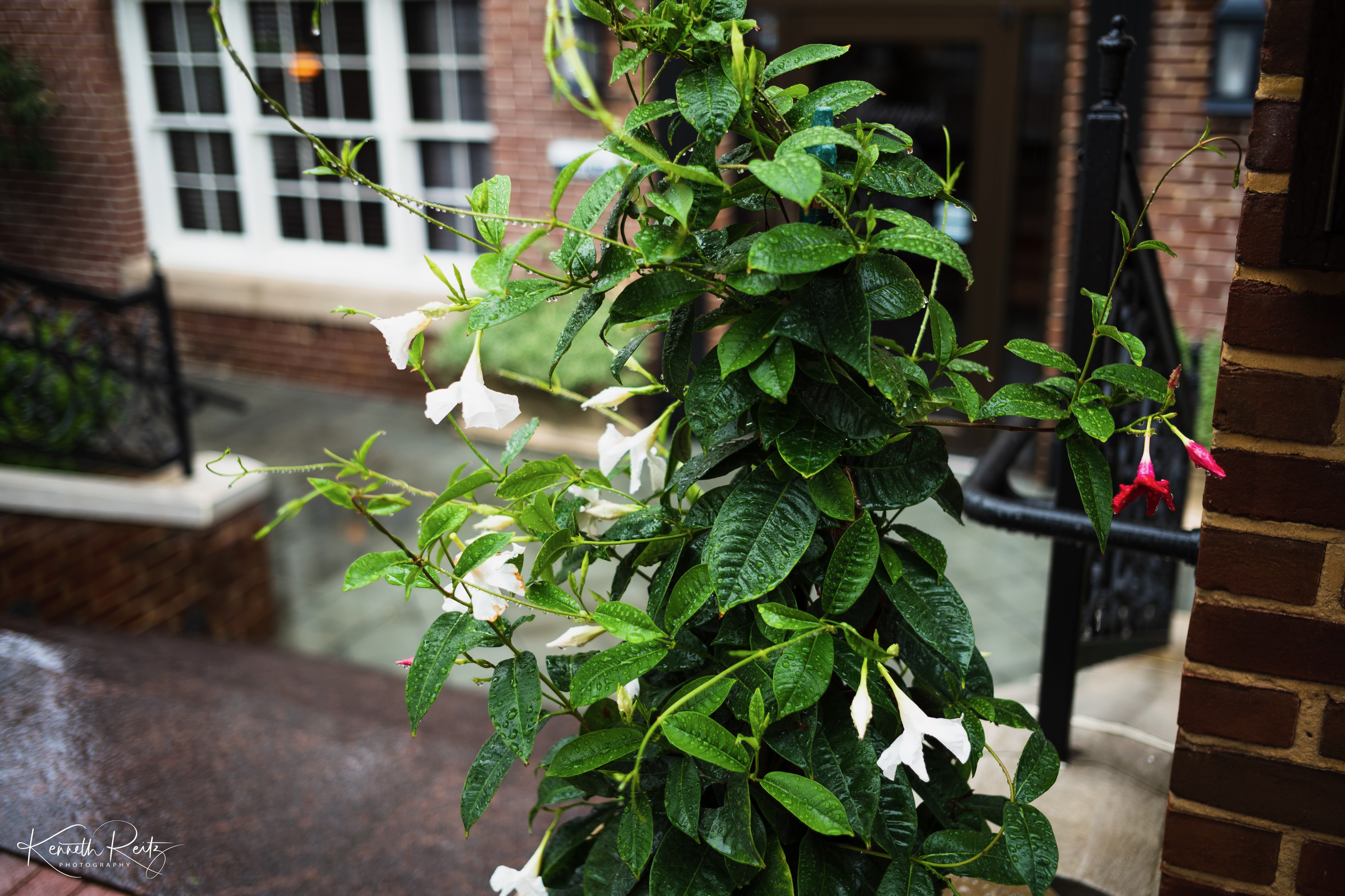 This photograph captures a lush green vine adorned with delicate white and pink flowers, glistening with raindrops. The composition is intimate, with a soft focus on the plants, highlighting their vibrant colors against the blurred brick backdrop. The moody lighting adds an air of tranquility, evoking a serene, rainy afternoon ambiance.