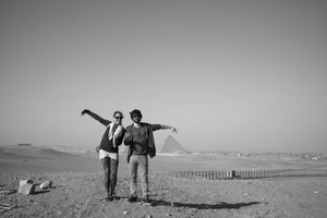 In this black-and-white photograph, two figures stand playfully in front of the Pyramids of Giza, exuding a sense of joy and spontaneity. The vast desert landscape envelops them, contrasting with their vibrant expressions, while the soft light creates a timeless quality. Their poses—arms outstretched—capture a moment of shared happiness against the iconic backdrop, imparting a sense of adventure and camaraderie.