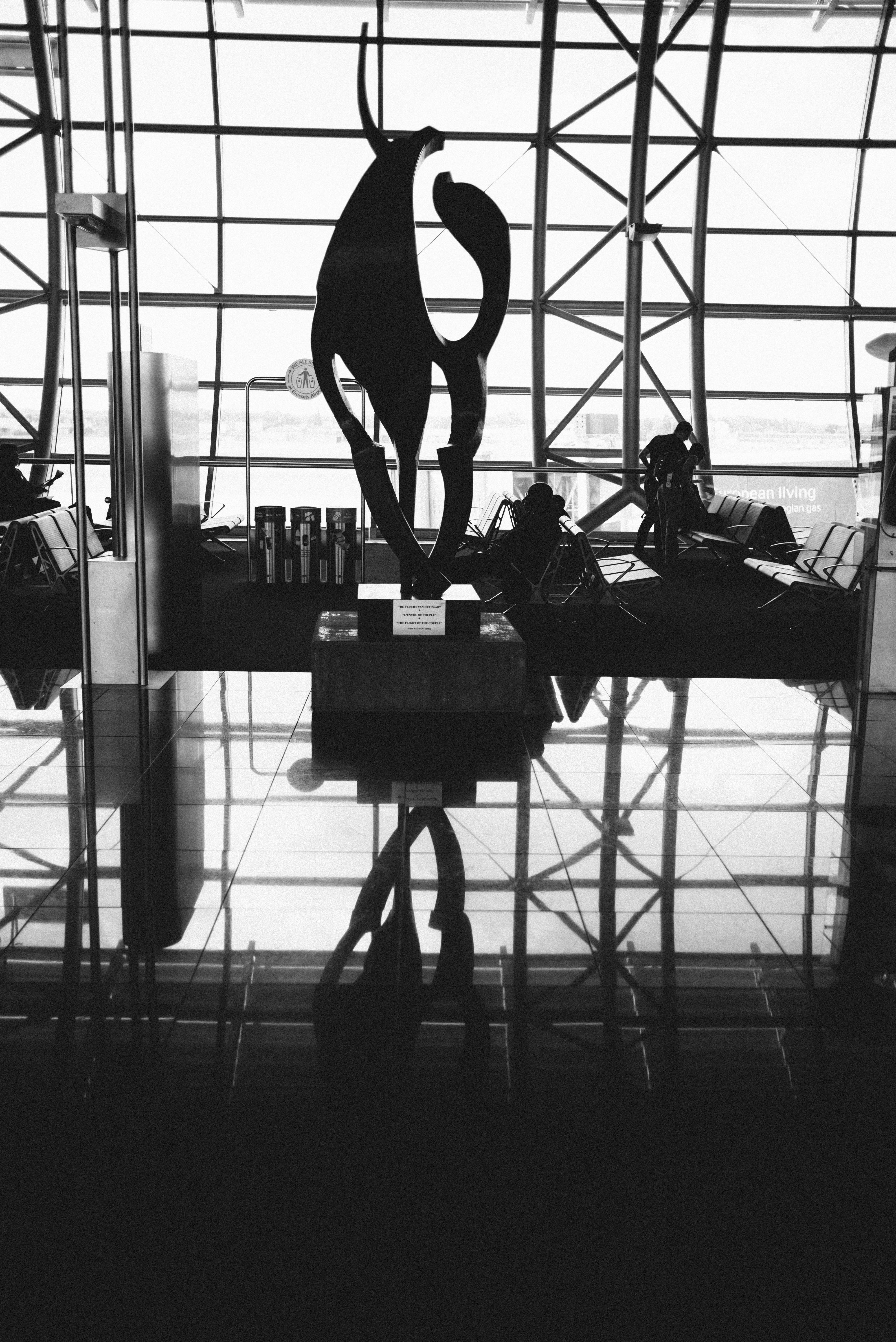 This striking black-and-white photograph captures a modern sculpture in an airport, its sleek black form contrasting against the bright, airy backdrop of floor-to-ceiling windows. The reflective floor enhances the sculpture's presence, casting a double image that adds depth to the composition. A sense of quiet contemplation pervades the scene, inviting viewers to pause amidst the hustle of travel.