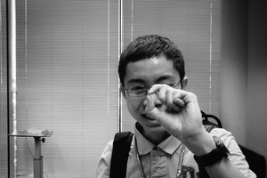 The photograph features a young boy with glasses, playfully showcasing a small object between his fingers, exuding a sense of excitement and curiosity. The stark black-and-white composition accentuates his cheerful expression, while the soft, diffused lighting adds warmth to the intimate setting. The blurred background draws attention to the subject, amplifying the lighthearted mood of the moment.