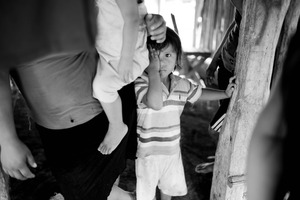 In this intimate black-and-white photograph, a young child stands amidst a blur of figures, peering curiously into the lens while partially obscured by a parent's presence. The soft lighting highlights the innocence of the moment, evoking a sense of vulnerability and connection within a close-knit environment. The juxtaposition of the child’s solemn expression against the surrounding activity conveys both the bustling life around them and their quiet introspection.