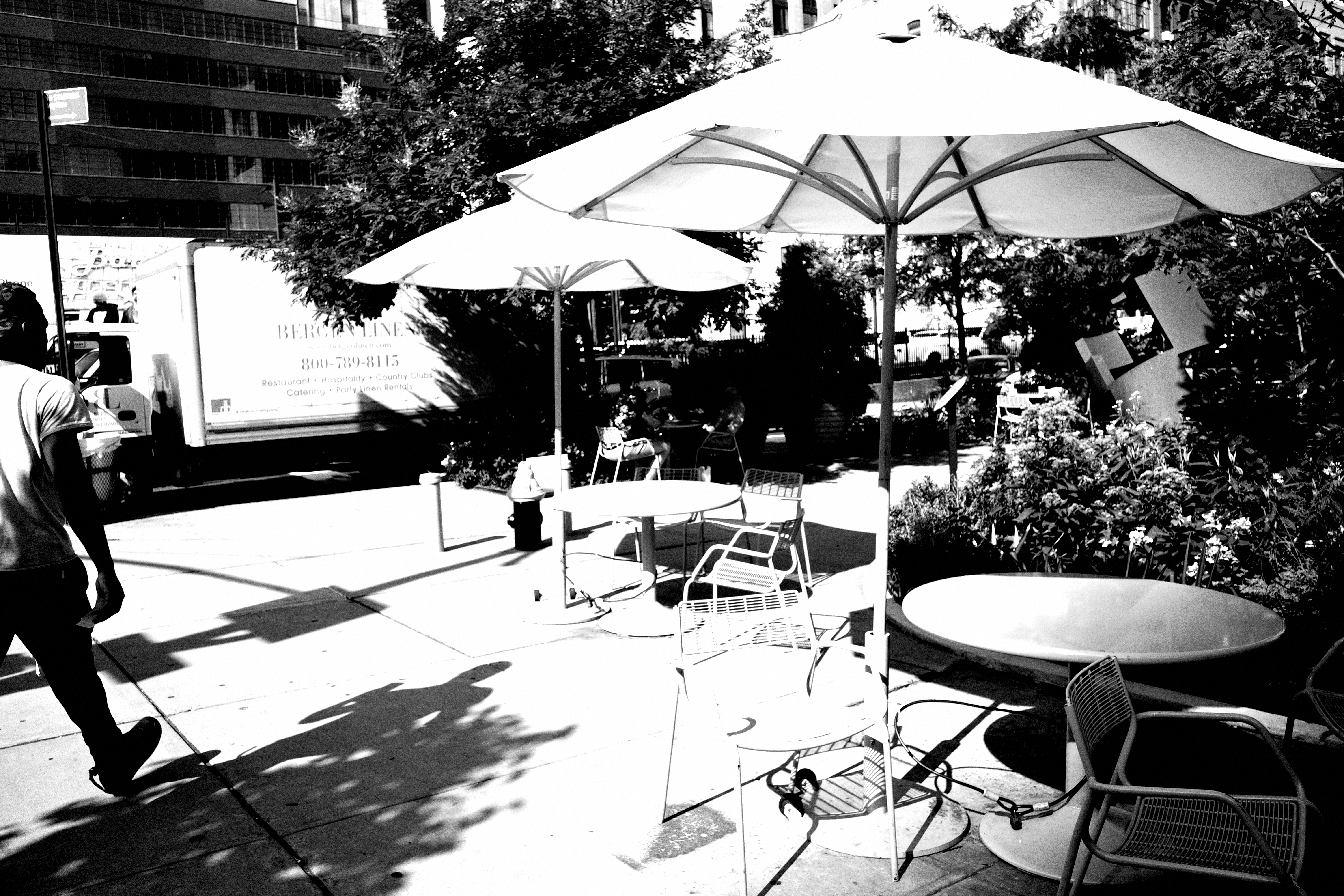 In a bustling city, a solitary figure walks past a sunlit café patio adorned with white umbrellas. The high-contrast black and white composition evokes a sense of nostalgia, capturing the interplay of light and shadow across the empty chairs and tables. This moment reflects a tranquil pause in the urban chaos, inviting contemplation amidst the vibrancy of city life.