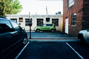 The photograph captures a striking contrast between a vibrant green car parked amidst muted surroundings of gray buildings and asphalt. Natural light pours in, enhancing the car's color while creating a sense of urban stillness. The composition cleverly juxtaposes the lively vehicle against the more subdued backdrop, evoking a mood of quiet contemplation in an everyday setting.