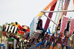 The photograph captures a moment of exhilaration on a fairground ride, where riders dangle from their seats amidst a colorful display of lights. The composition draws the eye towards the dynamic movement of the spinning mechanism, evoking feelings of excitement and joy. Soft daylight bathes the scene, enhancing the vibrant hues and the playful atmosphere of a fun-filled day at the carnival.