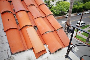 The photograph captures a close-up view of weathered terracotta roof tiles, their warm orange hues contrasting with the surroundings. A hint of overgrown moss and imperfections reveal the passage of time, evoking a sense of nostalgia. Soft, natural light enhances the earthy tones, bringing a serene, urban charm to the scene.