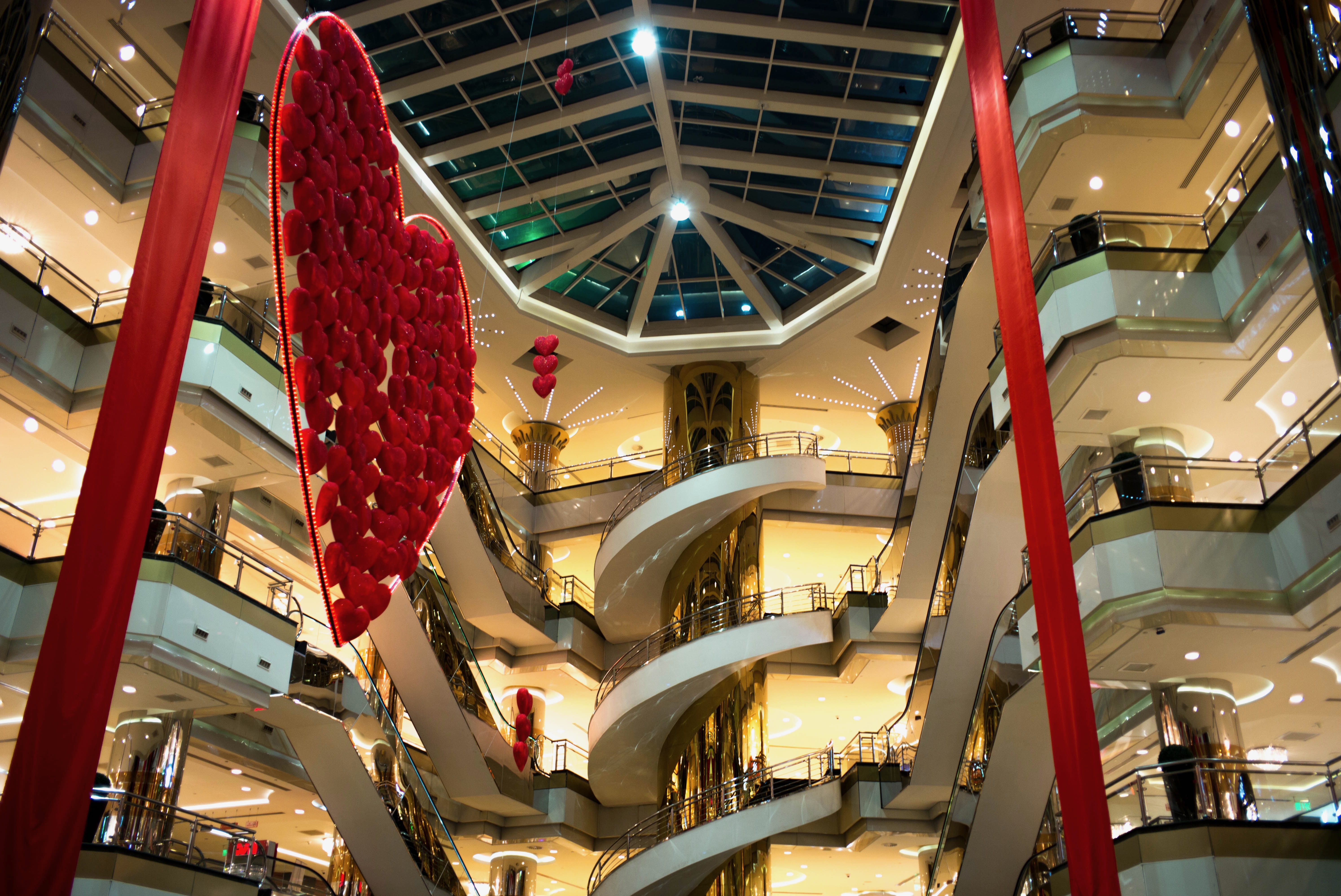 The photograph captures a striking interior of a shopping mall, dominated by a large heart installation that hangs gracefully from the ceiling. Warm lighting bathes the spiraling staircases and polished surfaces, creating an inviting atmosphere. The geometric lines and soft curves of the architecture juxtapose the playful heart motif, evoking a sense of romance and celebration.