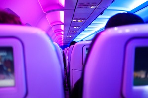 The photograph captures the interior of an aircraft, showcasing a symphony of blue and purple ambient lighting that creates a modern, vibrant atmosphere. The soft focus on the rows of seats evokes a sense of depth and invites the viewer into the intimate yet bustling space, enhancing the mood of adventure and anticipation. With the illuminated cabin contrasting against darker silhouettes, the scene captures the unique experience of travel in a contemporary setting.