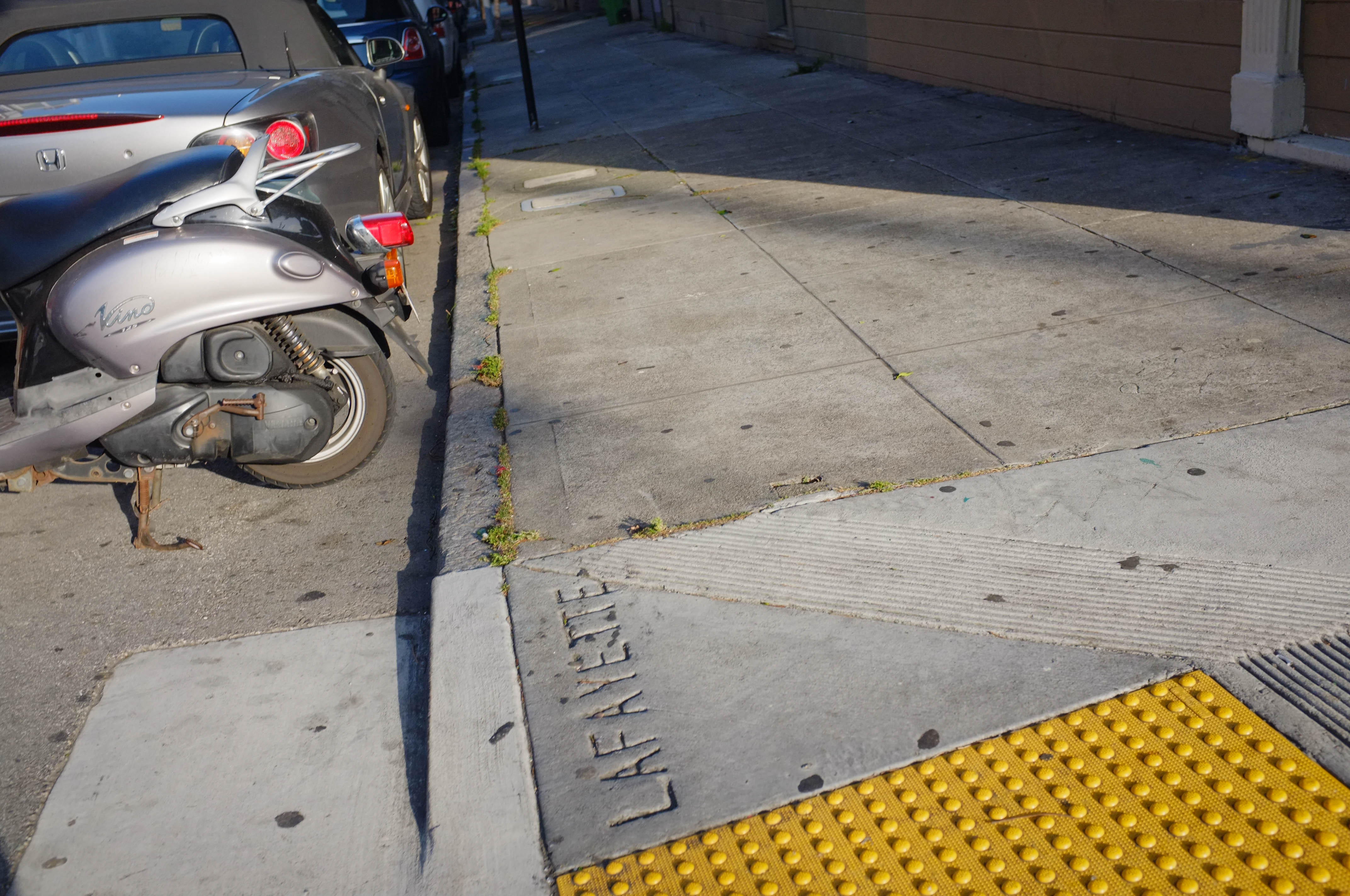 This photograph captures a quiet urban corner bathed in warm sunlight, with a silver scooter parked against a backdrop of muted gray pavement. The composition invites the viewer's eye to explore the subtle details, from the fading graffiti on the sidewalk to the bright yellow tactile paving, creating a contemplative and serene mood. Long shadows and gentle light contrast with the mundane setting, evoking a sense of stillness in the bustling city.