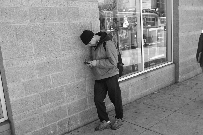 In this monochromatic photograph, a young individual leans against a textured wall, absorbed in their phone, evoking a sense of isolation amidst the bustling city. The stark lighting casts gentle shadows, enhancing the mood of quiet contemplation against the backdrop of urban life. The composition highlights the contrast between the solitary figure and the lively storefront reflected in the glass, suggesting a disconnection even in a crowded environment.