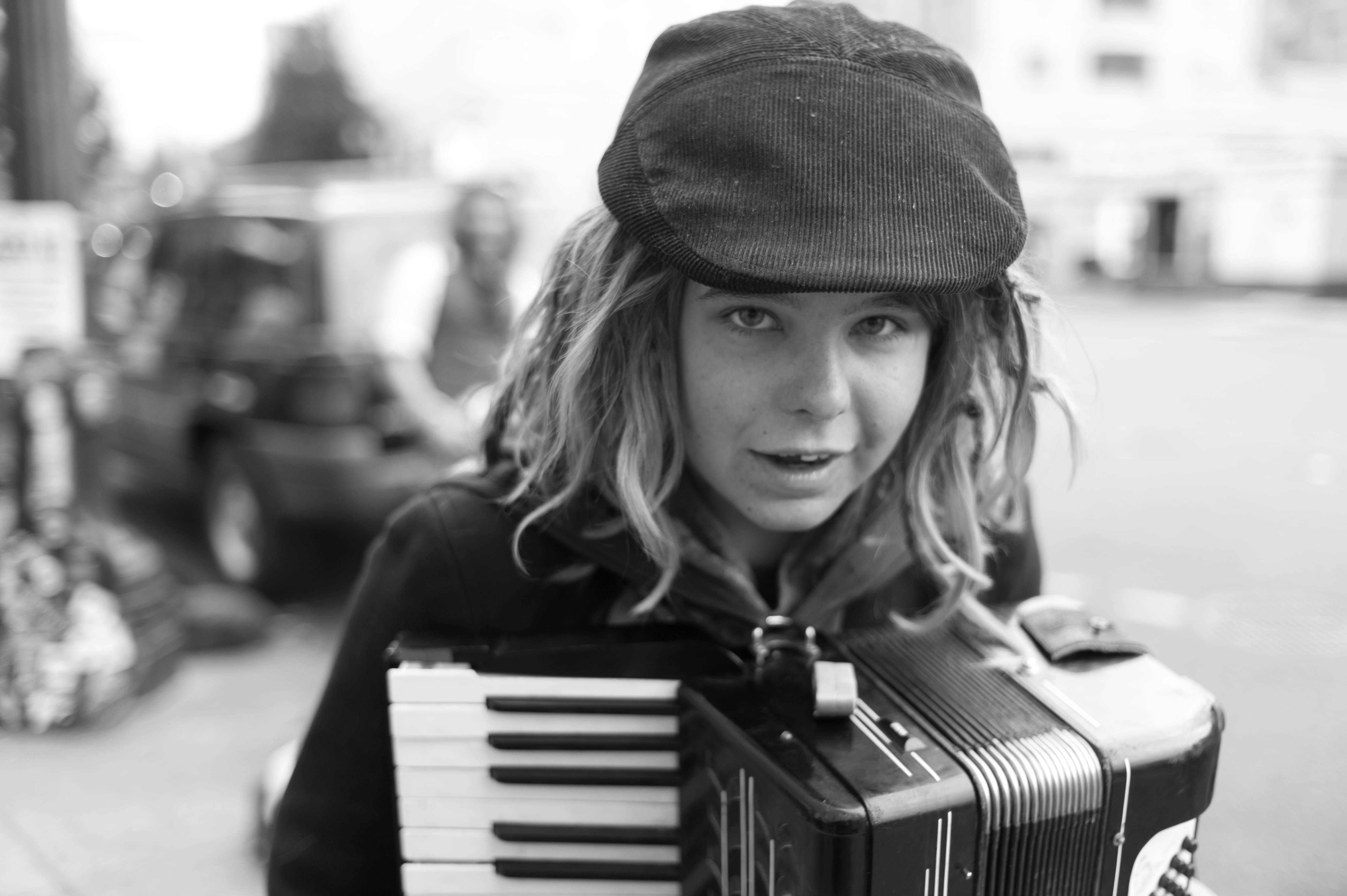 In this black-and-white portrait, a young musician gazes intently at the camera, clutching an accordion close to her chest. The soft, diffused lighting accentuates her expressive face and tousled hair, creating an intimate yet dynamic atmosphere that captures the spirit of street performance. The blurred background hints at a lively urban setting, enhancing the sense of spontaneity and artistry.