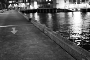 The photograph captures a quiet, dimly lit waterfront path, accented by a soft, blurred background. The reflective surface of the water contrasts with the concrete walkway, creating a tranquil yet slightly mysterious mood. An arrow points forward, inviting the viewer into the captivating atmosphere of the night.