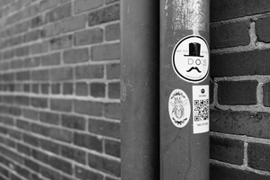 This photograph captures a close-up of two weathered pipes adorned with playful stickers, set against a backdrop of textured brick walls. The black-and-white composition evokes a sense of urban nostalgia, highlighting the vibrant dialogue between street art and architecture. Soft lighting enhances the contrast, drawing attention to the quirky details and the stories behind each sticker.