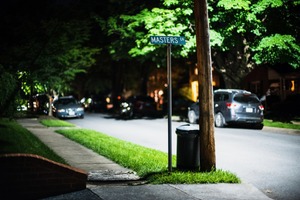 A quiet residential street at night, illuminated by soft, ambient light from distant houses. The focus is on a street sign reading 'MASTERS LN' beside a trash bin, standing amidst lush greenery that hints at the life hidden in the shadows. The mood is serene yet slightly mysterious, evoking a sense of calm and contemplation in the dark.
