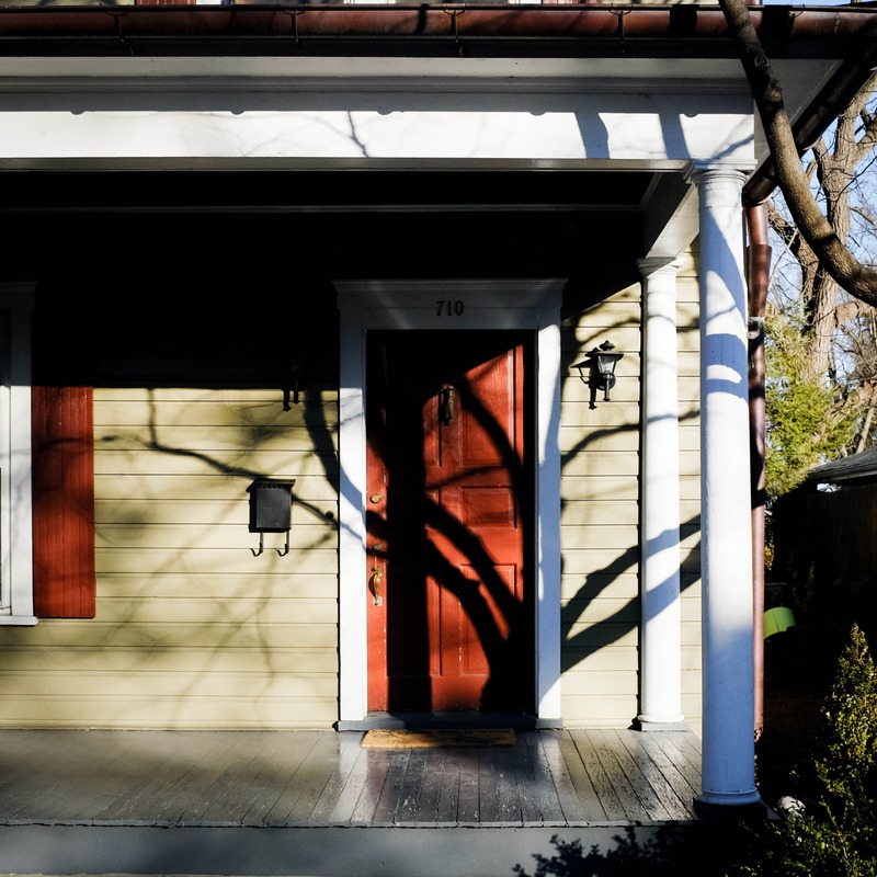 The photograph captures a charming façade with a bold red door framed by soft shadows cast by nearby trees. Gentle sunlight bathes the porch, emphasizing the warm, inviting colors of the house, while the shadows create an intriguing play of light and dark. This composition evokes a sense of nostalgia and tranquility, inviting the viewer to imagine the stories held within.