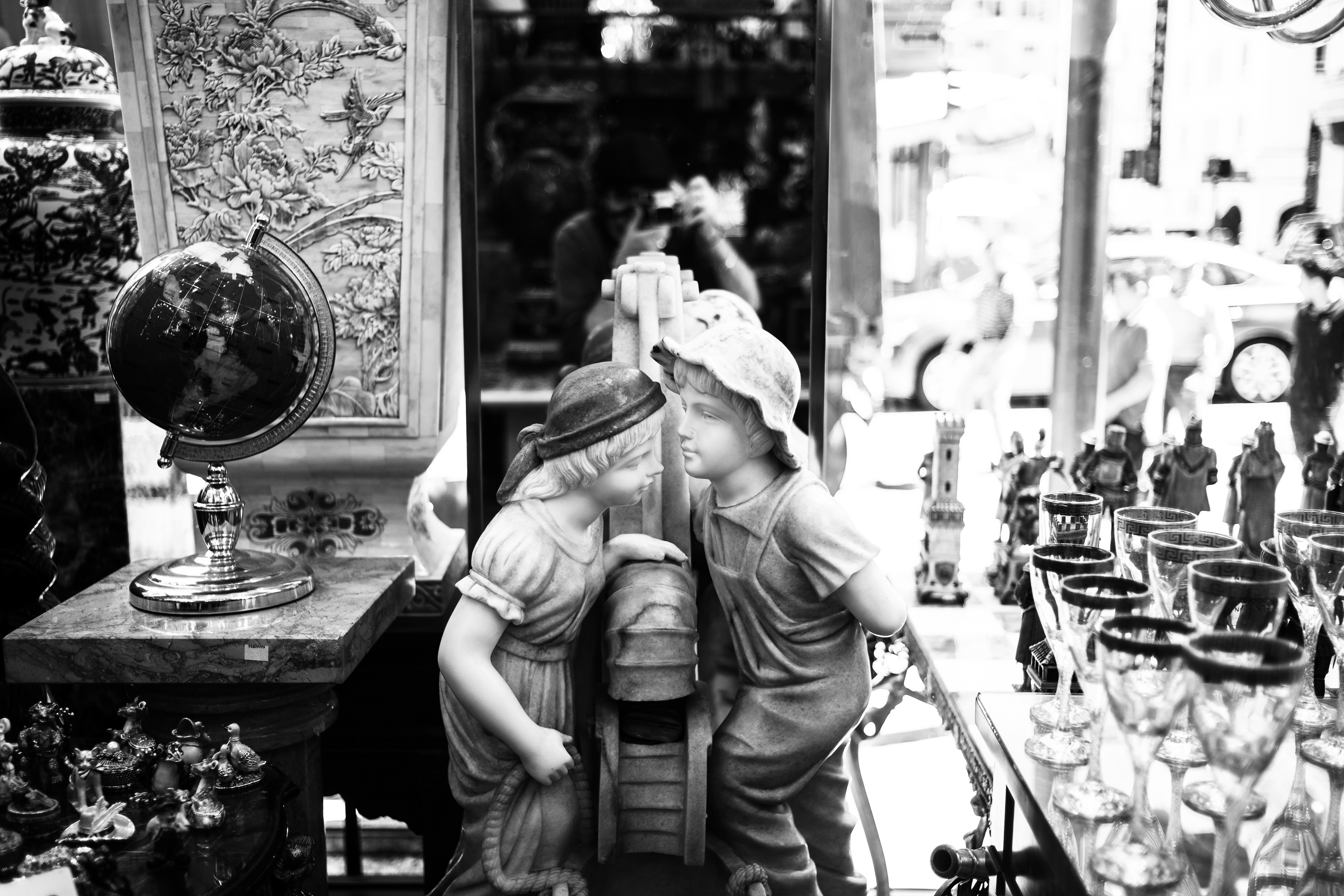 This charming black-and-white photograph captures two antique figurines of children, seemingly frozen in a moment of playful whispering. The contrasting textures of the polished globe and surrounding vintage items add depth, while subtle reflections hint at the lively world outside. The soft lighting enhances the nostalgic mood, inviting the viewer into a scene that feels both whimsical and timeless.