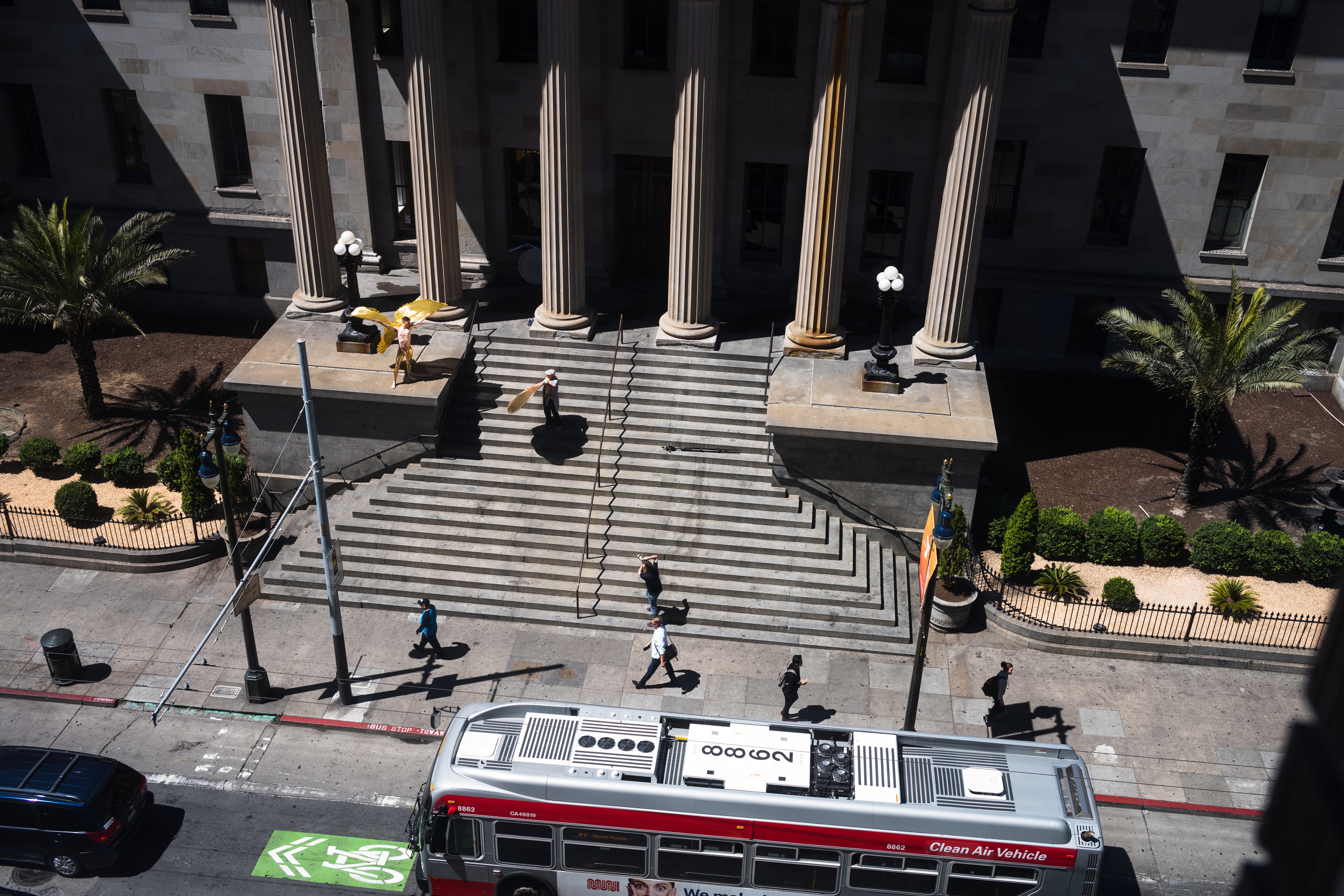 This high-angle photograph captures the grand entrance of a building framed by tall columns and surrounded by palm trees, exuding a sense of historical elegance. Bright, natural light bathes the scene, casting shadows that add depth and texture, while pedestrians and a bus animate the bustling street below, juxtaposing the serene architectural features. The composition highlights the harmony between structured grandeur and everyday urban life.