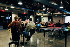 This photograph captures a lively gathering in a spacious, inviting venue, where groups of people engage in spirited conversation. The warm lighting creates an intimate atmosphere, highlighting the camaraderie among friends as they share laughter and stories against a backdrop of casual decor. The composition draws the eye to the central table, where the focus is on a quartet of friends deep in discussion, embodying a sense of community and enjoyment.