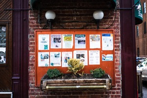 This photograph captures a vibrant bulletin board against a textured brick wall, showcasing a collage of newspaper clippings and colorful posters. The warm glow from the nearby lights adds a welcoming touch, while the greenery in the planter below brings a hint of life to the urban setting. The composition invites viewers to pause and explore the layered stories represented, blending the communal spirit with city life.