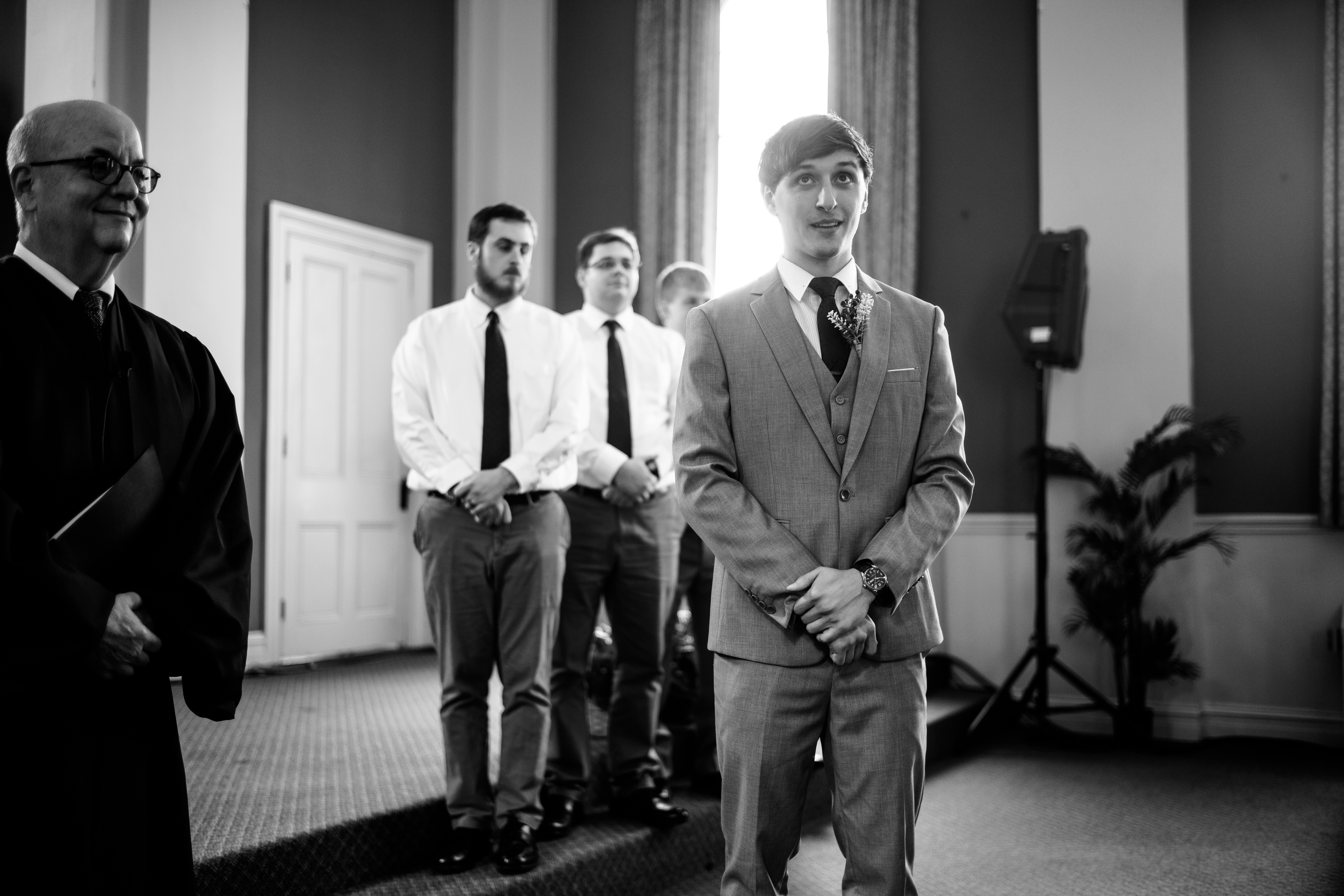 In this black-and-white photograph, a young man in a tailored suit stands at the forefront, his expression a mixture of excitement and nervousness. The soft light pouring through the window casts gentle shadows, enhancing the solemn yet hopeful atmosphere of the gathering. The composition draws the viewer's eye to the poignant moment, contrasting the gathered attendees in the background who reflect a sense of support and anticipation.
