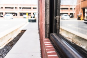 This photograph captures a peculiar juxtaposition of the mundane and the macabre, showcasing a skeletal figure reflected in a storefront window. The composition emphasizes lines and angles, leading the viewer's gaze from the brick wall to the street beyond, while soft, natural lighting adds an air of calmness, contrasting with the eerie subject. The overall mood provokes intrigue and contemplation, inviting thoughts on life and death in an everyday setting.