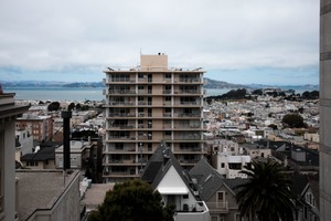 A mid-century building stands tall amidst a sea of rooftops and the distant bay, capturing a juxtaposition of urban life and natural beauty. The muted colors and overcast sky evoke a sense of calm solitude, while the composition draws the eye from the foreground's intricate architecture to the expansive water beyond. This image reflects the layered complexity of city living against the backdrop of tranquil waters and gentle hills.