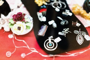 This photograph captures an array of intricate jewelry pieces laid against a striking black backdrop, showcasing their unique designs. The soft lighting adds an inviting warmth, highlighting the delicate details of both the silver pendants and the faux floral arrangement nearby. The composition invites the viewer to explore the textures and shapes, creating a sense of allure and nostalgia.