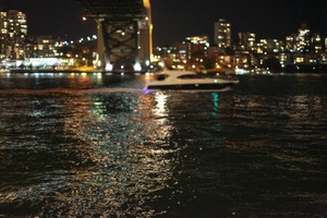 A sleek boat glides across dark waters, creating gentle ripples that catch the shimmering city lights. The scene is illuminated by the soft glow of buildings under the night sky, juxtaposing urban vibrance with the tranquil waters below the arching bridge. The overall mood is one of serene exploration amidst the bustling life of the city.