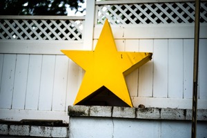 The photograph captures a vibrant yellow star resting against a white, textured fence. Its bright color contrasts beautifully with the muted surroundings, evoking a sense of whimsy and nostalgia. The soft, diffused lighting enhances the star's bold presence, casting gentle shadows that add depth to the composition.