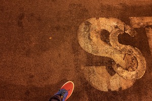 A single shoe, brightly colored against a textured asphalt surface, stands beside an elegantly faded 'S' marking on the ground. The warm, amber lighting casts a soft glow, evoking a contemplative mood amidst the urban setting. The composition draws the eye to the contrast of the shoe's vibrant hue against the muted tones of the pavement, suggesting a moment of stillness in the hustle of city life.