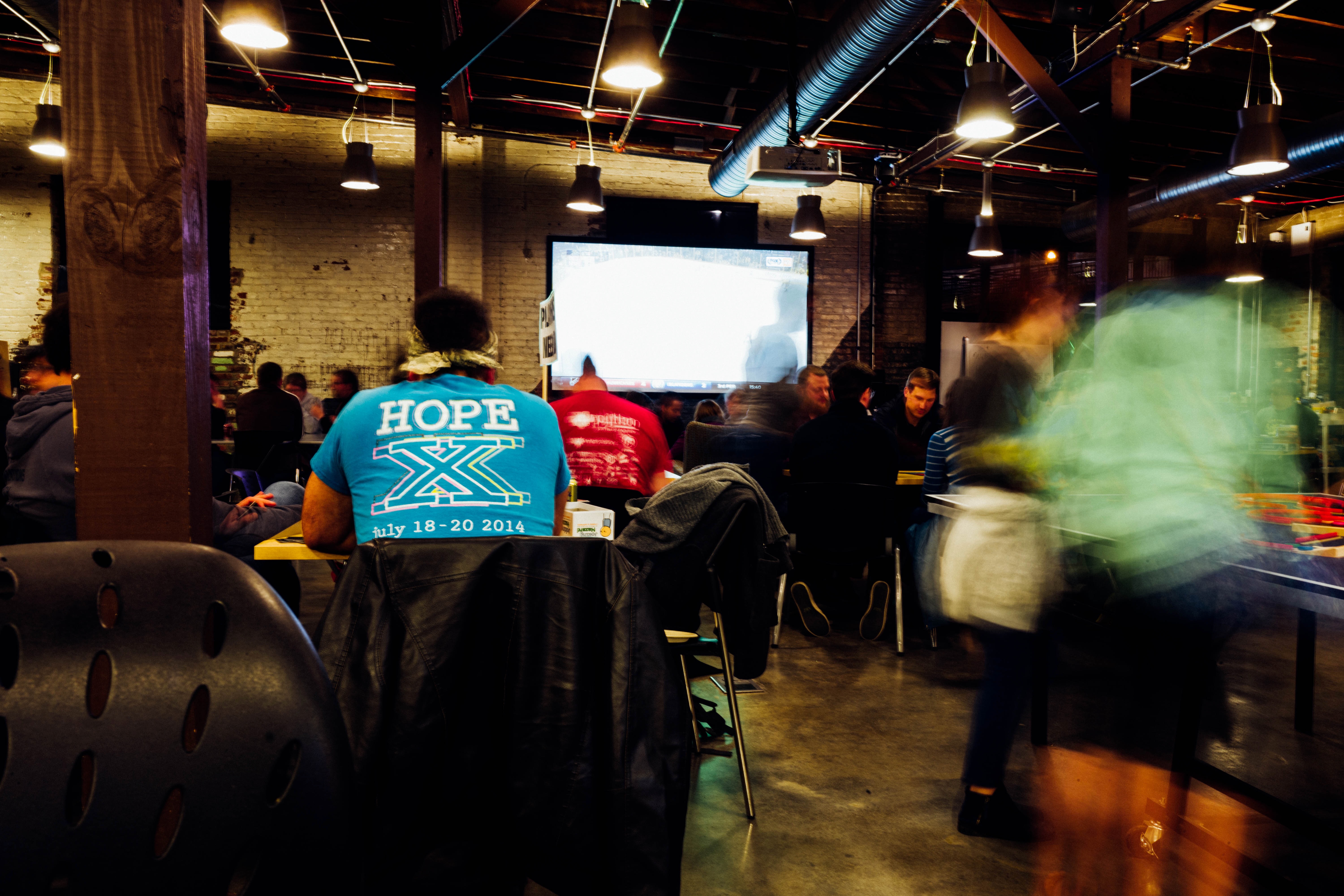 In a lively indoor space, patrons are engaged with a large screen that broadcasts an event, creating an atmosphere of anticipation and excitement. The dimmed lighting highlights the vibrant colors of clothing, with people in motion blurring around static tables, evoking a sense of community and shared experience. The industrial decor and warm hues add to the welcoming yet dynamic mood of this gathering.