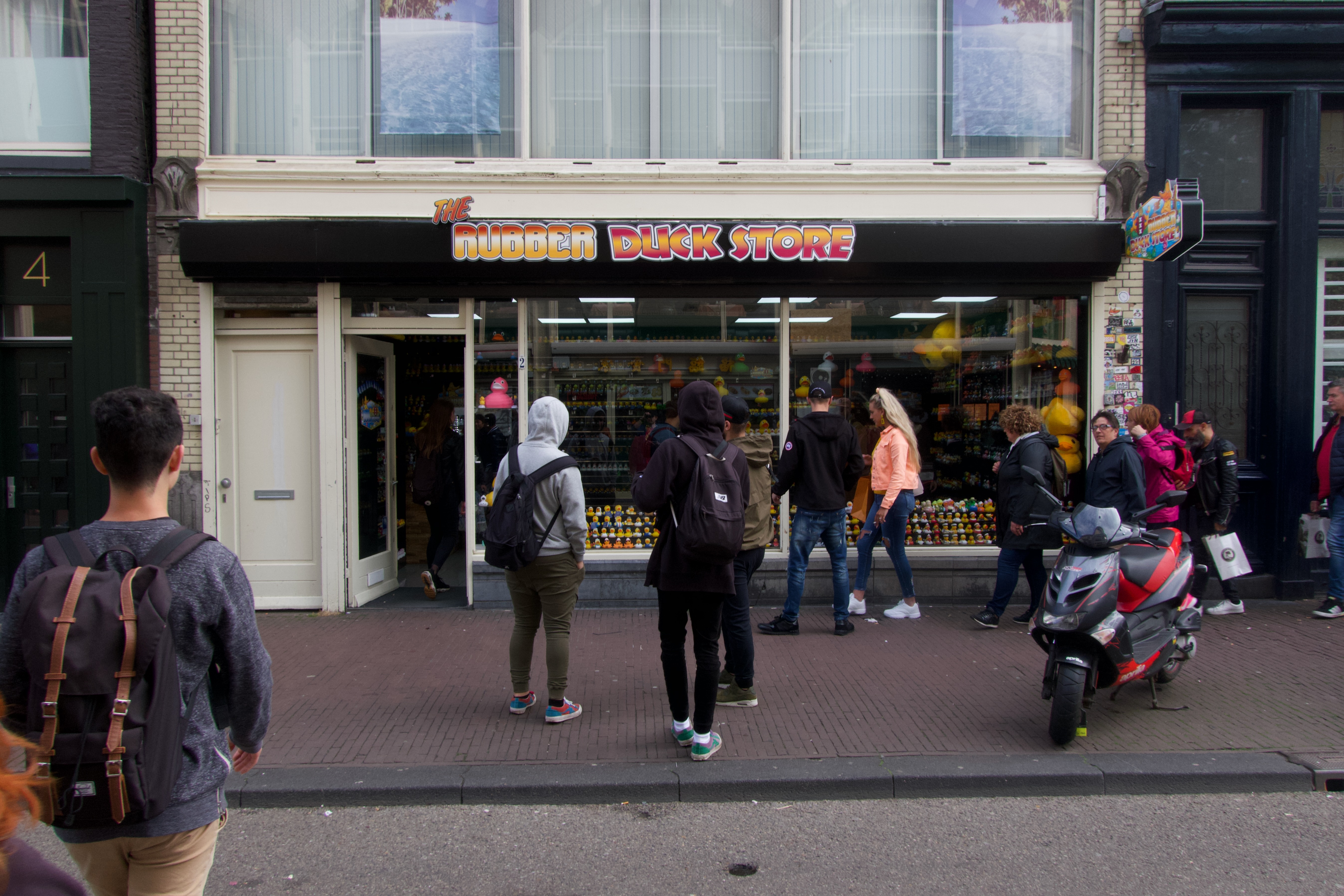 The photograph captures a quirky storefront, 'The Rubber Duck Store', bustling with curious onlookers drawn to its playful display of colorful rubber ducks. The grey sky casts a soft, diffused light, lending a casual yet vibrant atmosphere to the scene, as shoppers in casual attire explore the novelty shop. The composition, featuring a mix of people and a parked scooter, adds to the lively urban vibe, inviting curiosity and smiles.