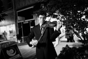 In the heart of the evening, a young violinist captivates passersby with his passionate performance. The black-and-white tones amplify the contrast of his formal attire against the bustling yet blurred background, creating a sense of intimacy amidst the nightlife. Soft lighting from nearby storefronts casts a gentle glow, highlighting his focused expression and the vibrant energy of street art.