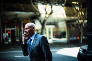 A sharply dressed man speaks on his phone, captured in a moment of concentration amidst a blurred urban background. The soft lighting and muted colors evoke a sense of quiet determination, while the trees in the backdrop hint at the bustling life surrounding him. The slight motion blur enhances the feeling of movement in the dynamic city environment.