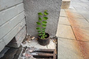 A lone green plant emerges from a rusty pot, wedged between a textured wall and a gray pavement marred by discarded cigarette butts. The contrasting vibrancy of the leaves against the surrounding urban decay creates a poignant sense of resilience and hope. Soft natural light gently illuminates the scene, highlighting the plant's persistent growth in an unforgiving environment.