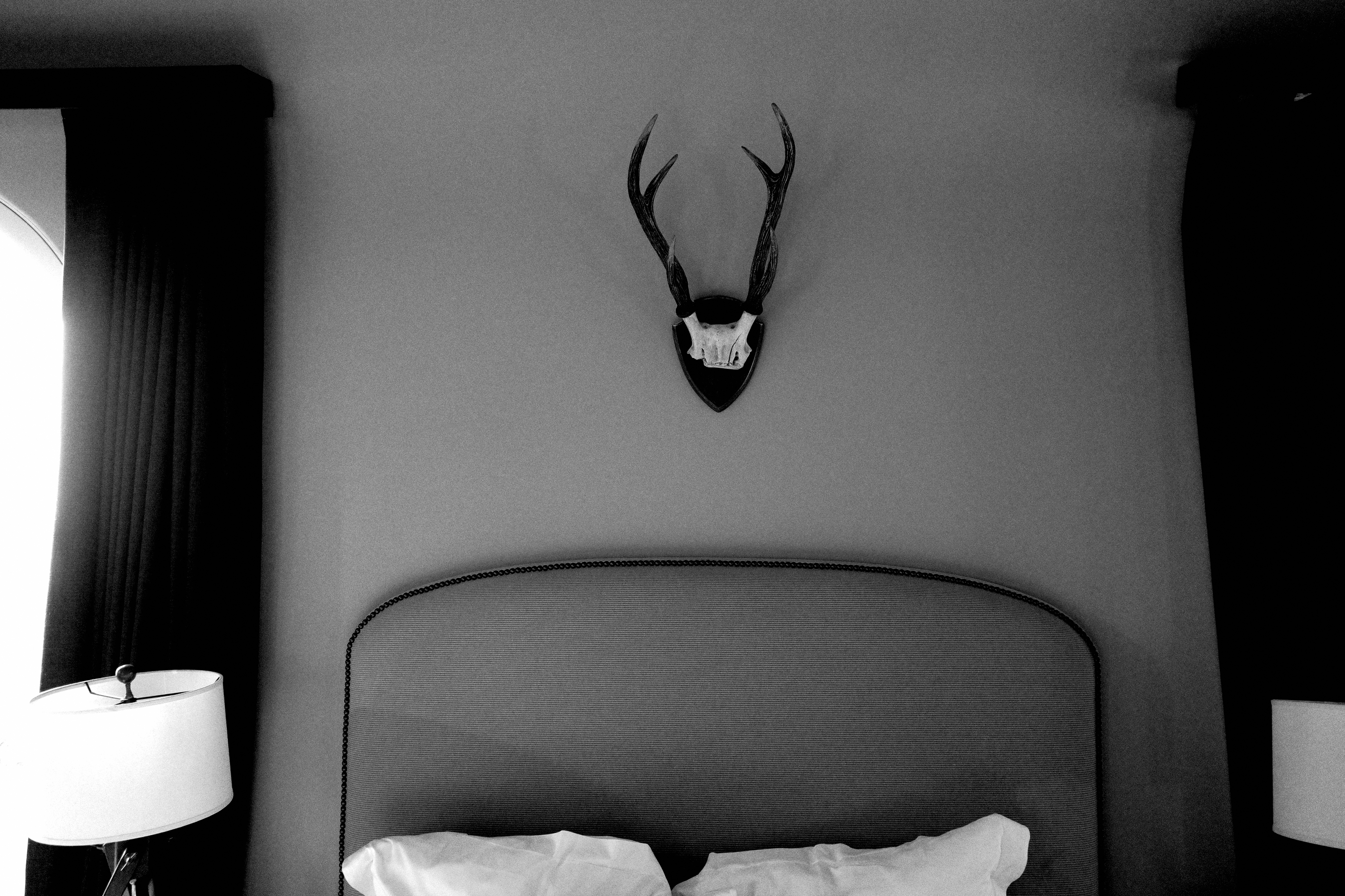 This photograph captures a minimalist bedroom scene, dominated by a darkened wall adorned with a mounted set of antlers, evoking a sense of rustic elegance. The monochrome tones create a moody atmosphere, complemented by soft lighting from a nearby lamp and the gentle curve of the bed's headboard. It contrasts warmth and starkness, inviting contemplation in its stillness.