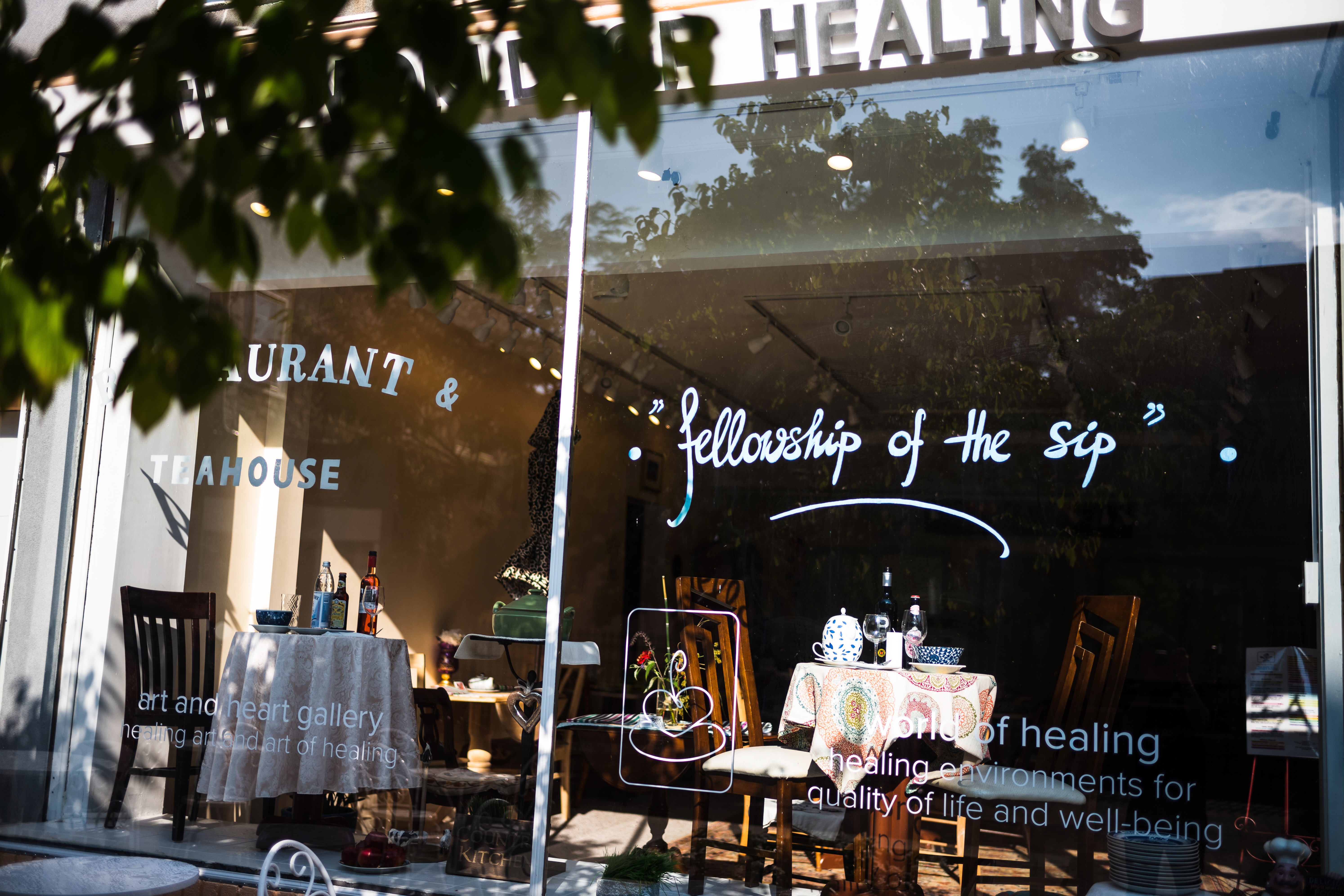 The photograph captures a charming teahouse front illuminated by soft, natural light, emphasizing the inviting atmosphere. A beautifully set table with vibrant tablecloth and decorative elements hints at warmth and community, while the handwritten sign 'Fellowship of the Sip' evokes a sense of connection. The gentle bokeh of the foliage in the foreground adds a cozy touch, creating an intimate scene for visitors.