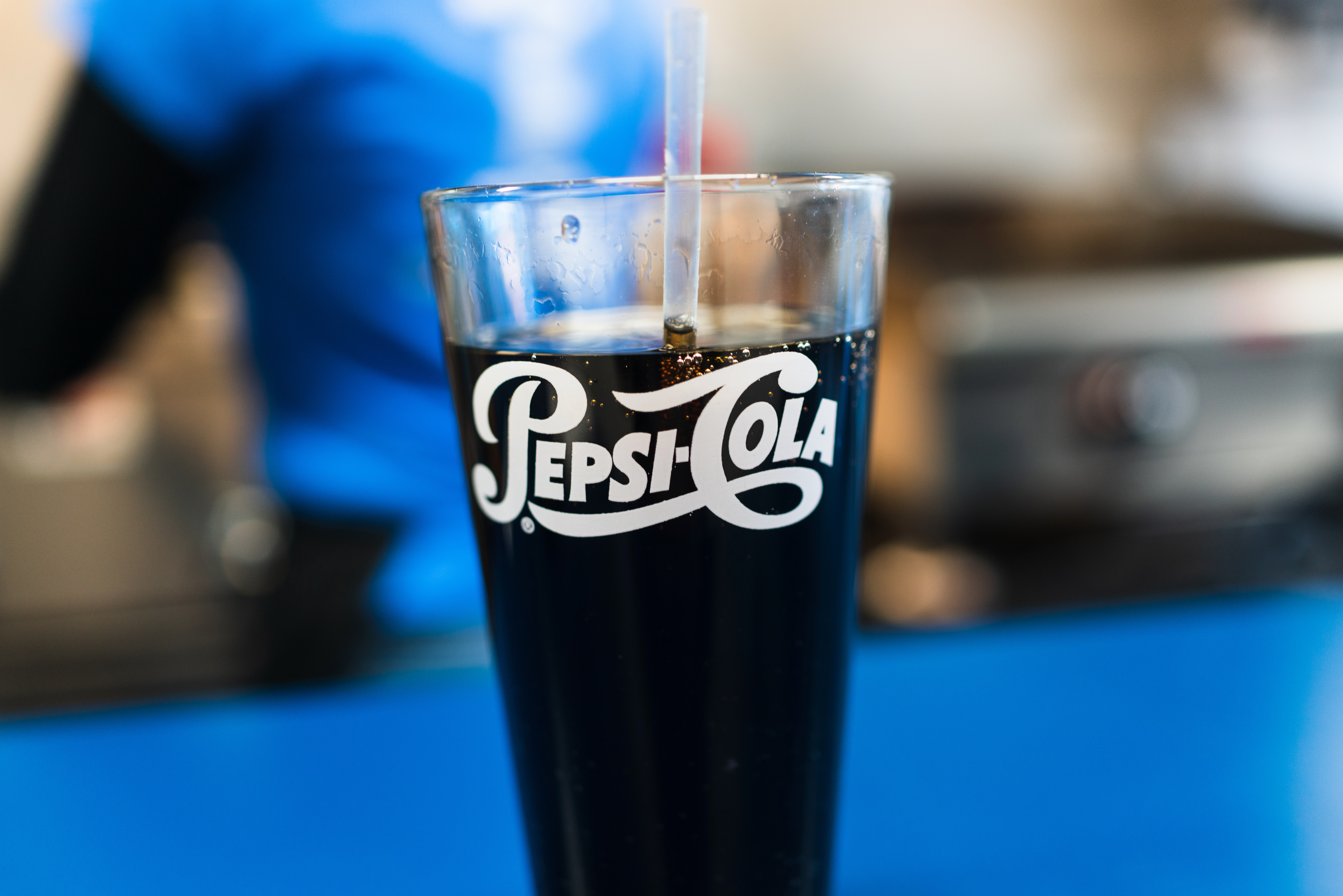 A vibrant glass of Pepsi-Cola stands prominently against a softly blurred background, infused with hints of blue and warmth from the rest of the setting. The glass captures light, highlighting the effervescent bubbles rising in the dark soda, creating an inviting mood. The overall composition conveys a refreshing moment, perfect for a casual dining experience.