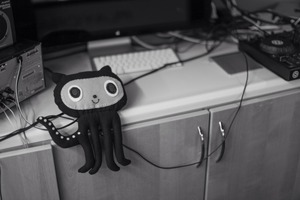A charming plush octopus character rests on a cluttered desk, contrasting the sleek electronics surrounding it. The monochromatic palette adds a nostalgic mood, highlighting the soft texture of the toy against the hard surfaces of the computer setup. Tangled cables weave through the scene, creating a playful chaos that complements the whimsical nature of the plush figure.