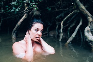 In this striking photograph, a woman emerges from a tranquil body of water, surrounded by tangled roots and lush greenery. The muted, soft lighting casts an ethereal glow on her skin, enhancing her contemplative expression. The composition contrasts the depth of nature with the vulnerability of her pose, creating a sense of intimate serenity.