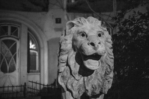 A striking stone lion statue stands proudly in the dim evening light, capturing a sense of both majesty and stillness. The contrasting shadows play on its features, enhancing its expressive face and lending an air of timelessness amidst the urban backdrop. The soft glow from the window hints at life beyond, creating a captivating interplay between the natural and the manmade.