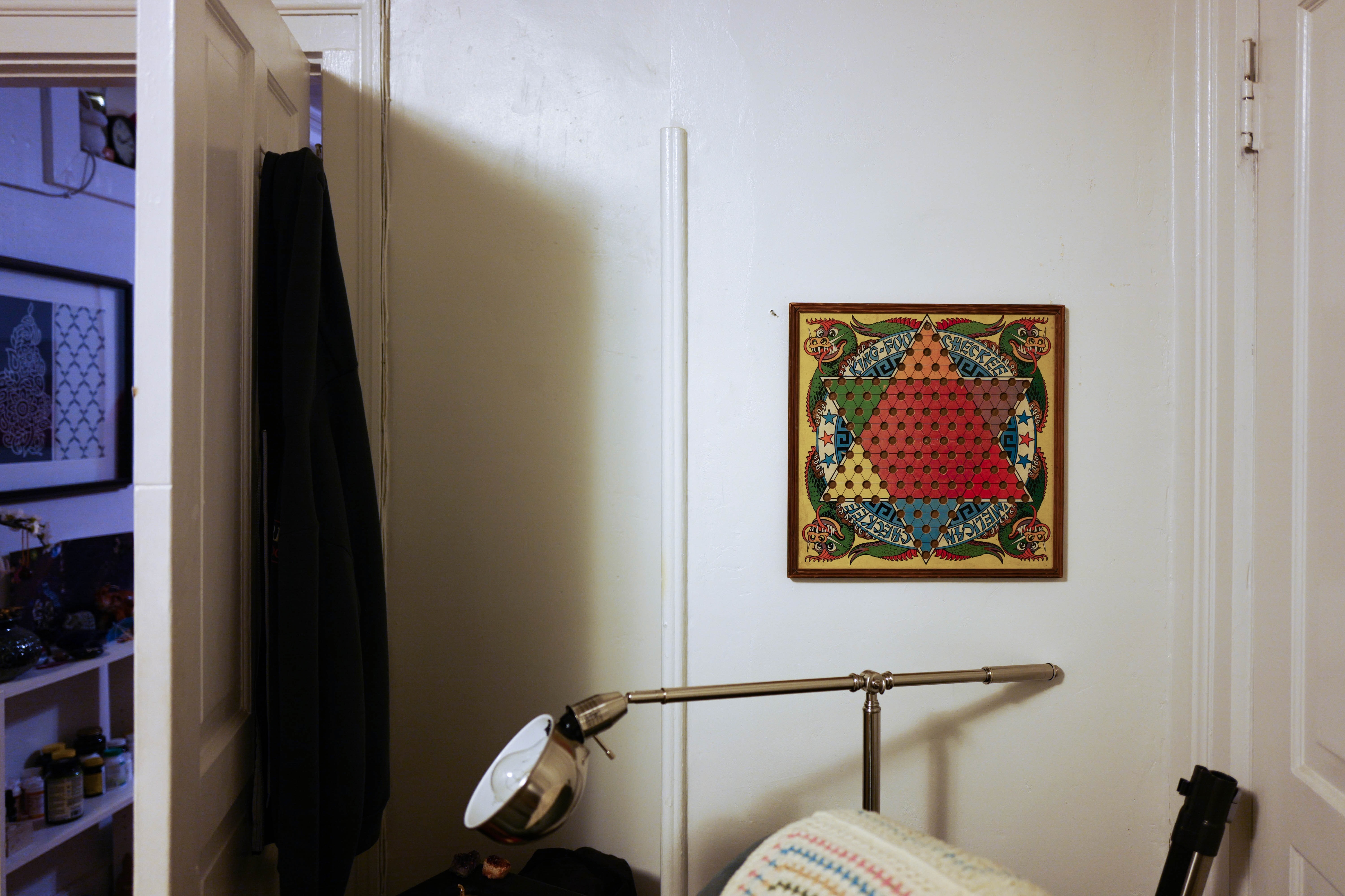 The photograph captures a cozy corner of a room, featuring a vibrant geometric artwork hanging on a white wall. Soft light filters in, illuminating the intricate design while casting gentle shadows on surrounding objects, creating a warm and inviting mood. The composition draws the eye towards the artwork, contrasting it with the dark clothing and minimalist furnishings nearby.
