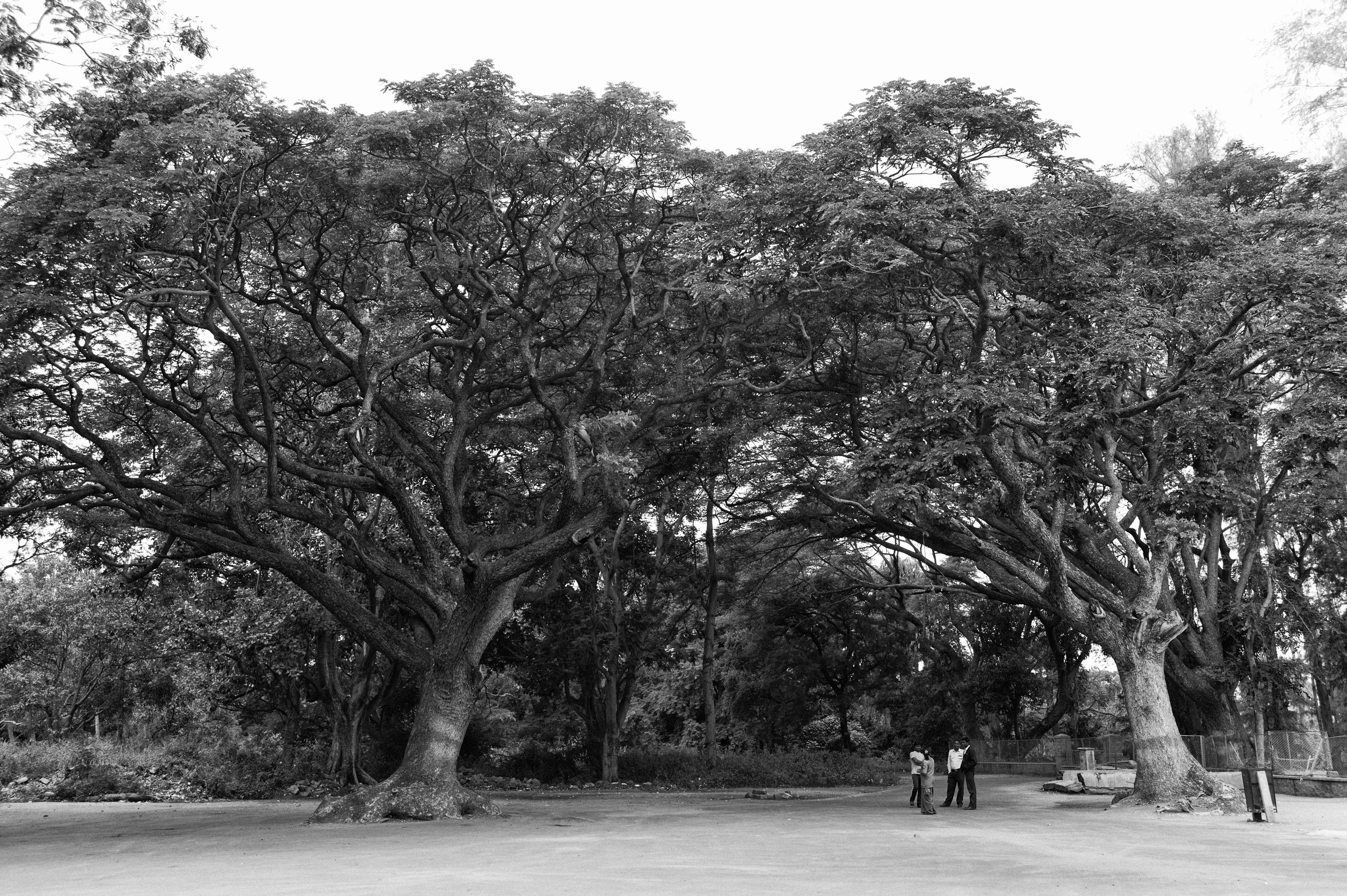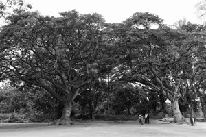 In this striking black and white photograph, two towering trees dominate the scene, their intricate branches stretching outward like a protective canopy. The contrast between the light and shadow creates a serene, contemplative mood, while the figures at the base add a sense of scale and connection to the natural world. The composition invites viewers to ponder the enduring presence of nature amidst the passage of time.